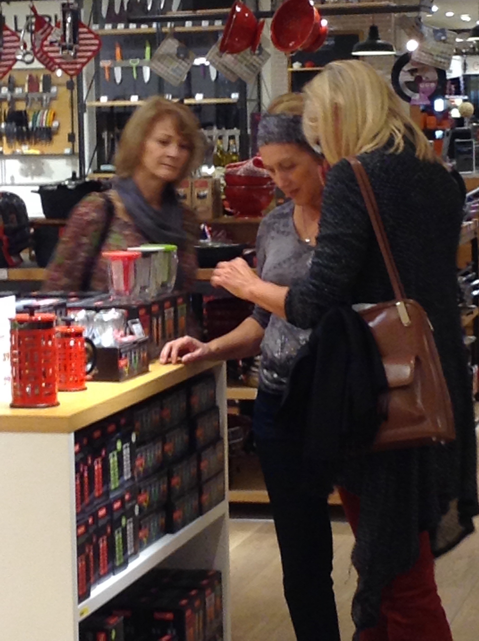 Then there’s shopping at the BHV in the Marais. Stands for Bazaar Hotel de Ville but I think of it as “Blazing Hot de Ville” because the air is stifling inside. To help me make my case on just how Parisian we’ve become, please know that the picture here is of an extreme examination of a coffee press which did not get purchased but was under consideration. Know, too, that what was purchased was some bubble wrap and postage tape from the basement’s hardware store. I can promise you no tourists were in line at this particular caisse (cash desk).