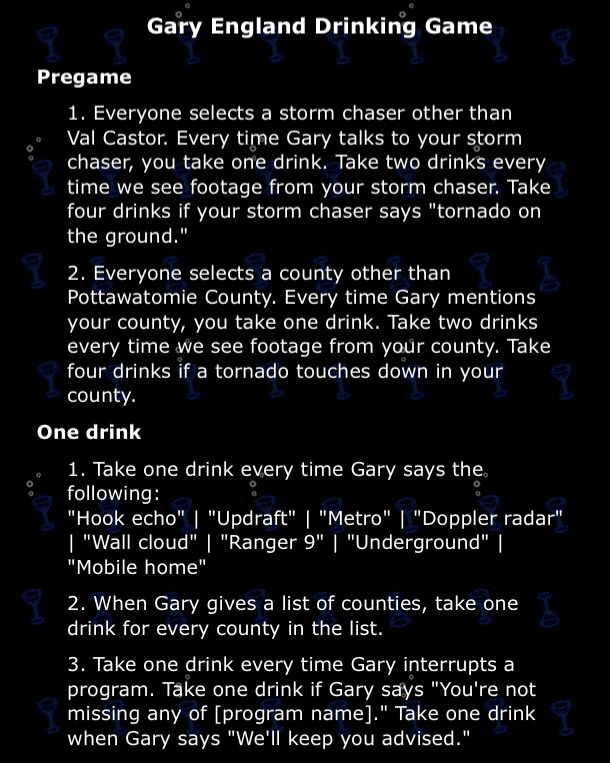 No self-respecting Okie will ever get invested in a TV show because we all know it will be preempted by weather. Our weathermen/women are on air like Jerry Lewis in a telethon only they never ever leave the air. One of our local weather guys becomes giddy when the weather turns sour. He gets so close to the camera that you can see the lipstick on his sadistic smirk. Another wears sparkly ties when he believes he’s going to be on air all night. One recently-retired longtime local weatherman, Gary England, had a drinking game inspired by him. (I kid you not, you must Google it now, I will wait…). Here is an excerpt of the Rules.