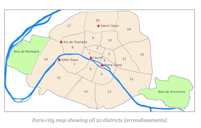 Paris is arranged in a snail shape of 20 arrondissements. Number 1 starts near the center of Paris and as the snail spirals out, the numbers get larger. Virtually every corner building in Paris shows the street name and the arrondissement number (sometimes concealed in the last two digits of the zip code) so if you know your snail you can’t get lost.