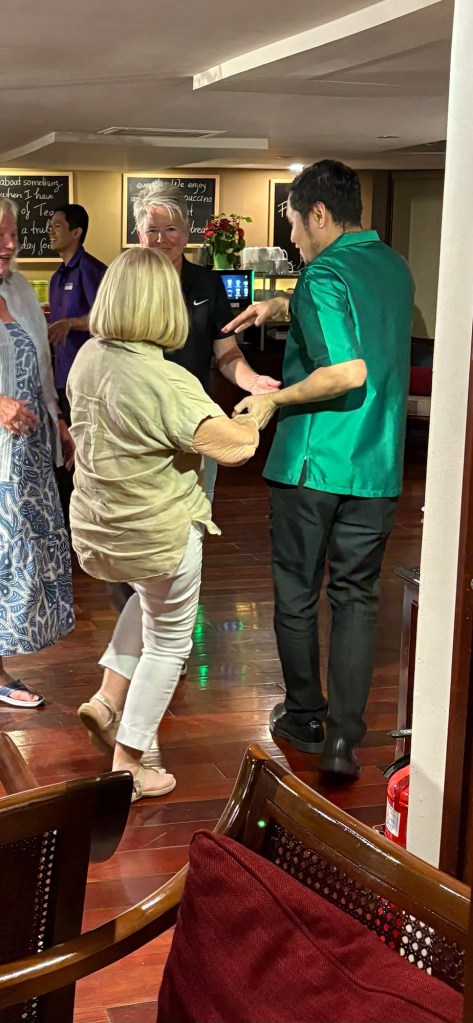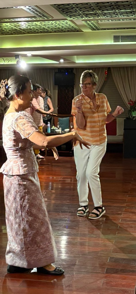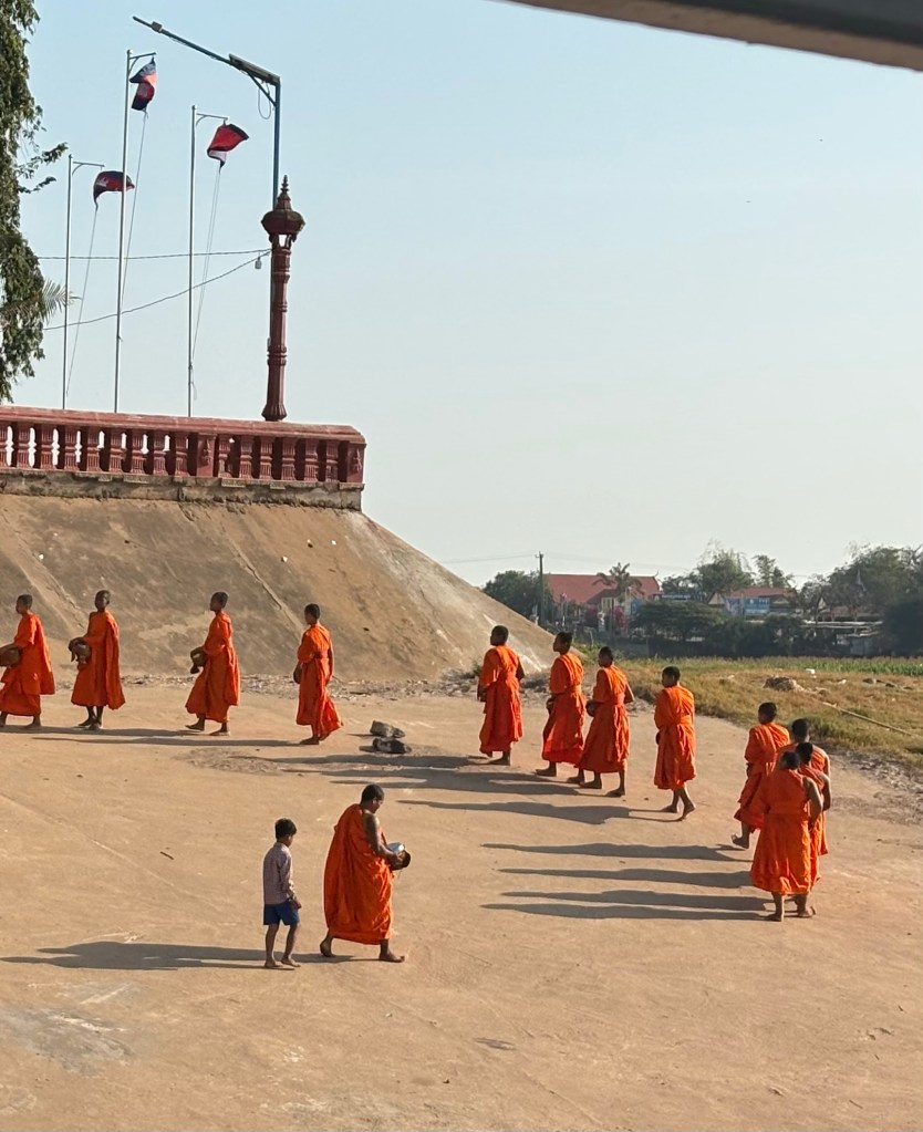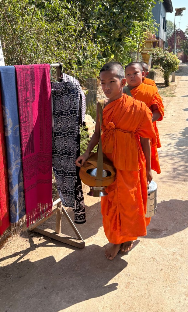 Before our morning excursion, monks came in procession accepting food offered by our ship. We all got a kick out of a little boy who was tagging along looking for lunch, like they wouldn’t notice he wasn’t wearing a saffron robe.