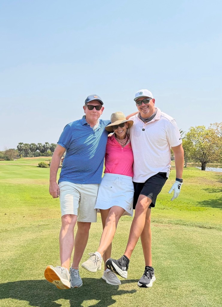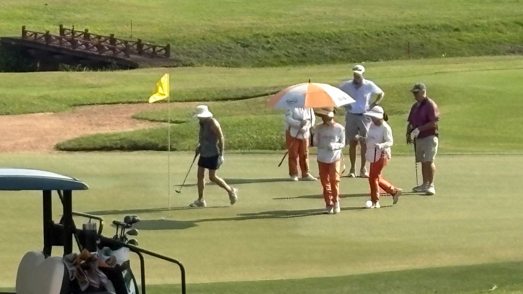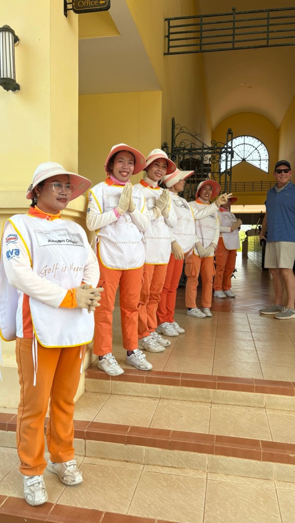 Six of us went golfing (you can see a floating village any day). We were greeted by female caddies, each with our names on their vests. They held umbrellas over our heads and brought us cold towels and that’s not nothing in a country where it’s been 90+ temperature and 80+ humidity.