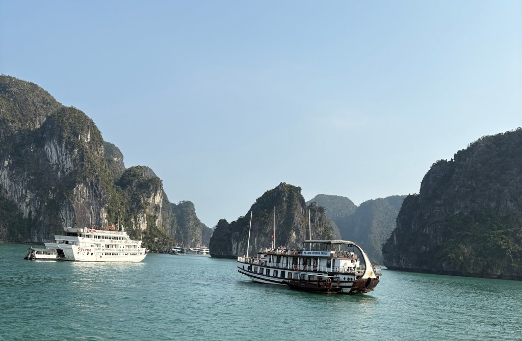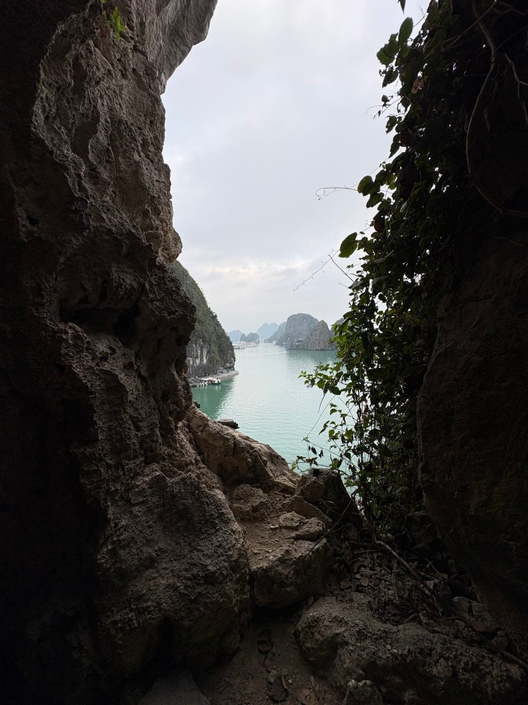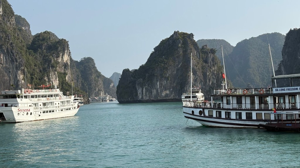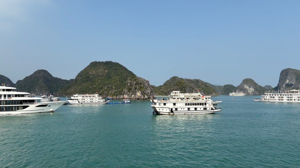 Ha Long Bay is a postcard. Giant limestone mounds, known as karsts, split the sea and rise upwards. There are boats all around. The sea air is overtaken by the smell of boat diesel. The bay waters are a deep emerald green.